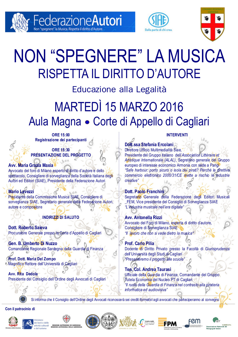 Oggi alle 15.00, presso l’Aula Magna della Corte di Appello di Cagliari, si terrà il Convegno dal titolo ”NON “SPEGNERE” LA MUSICA RISPETTA IL DIRITTO D’AUTORE – Educazione alla legalità”