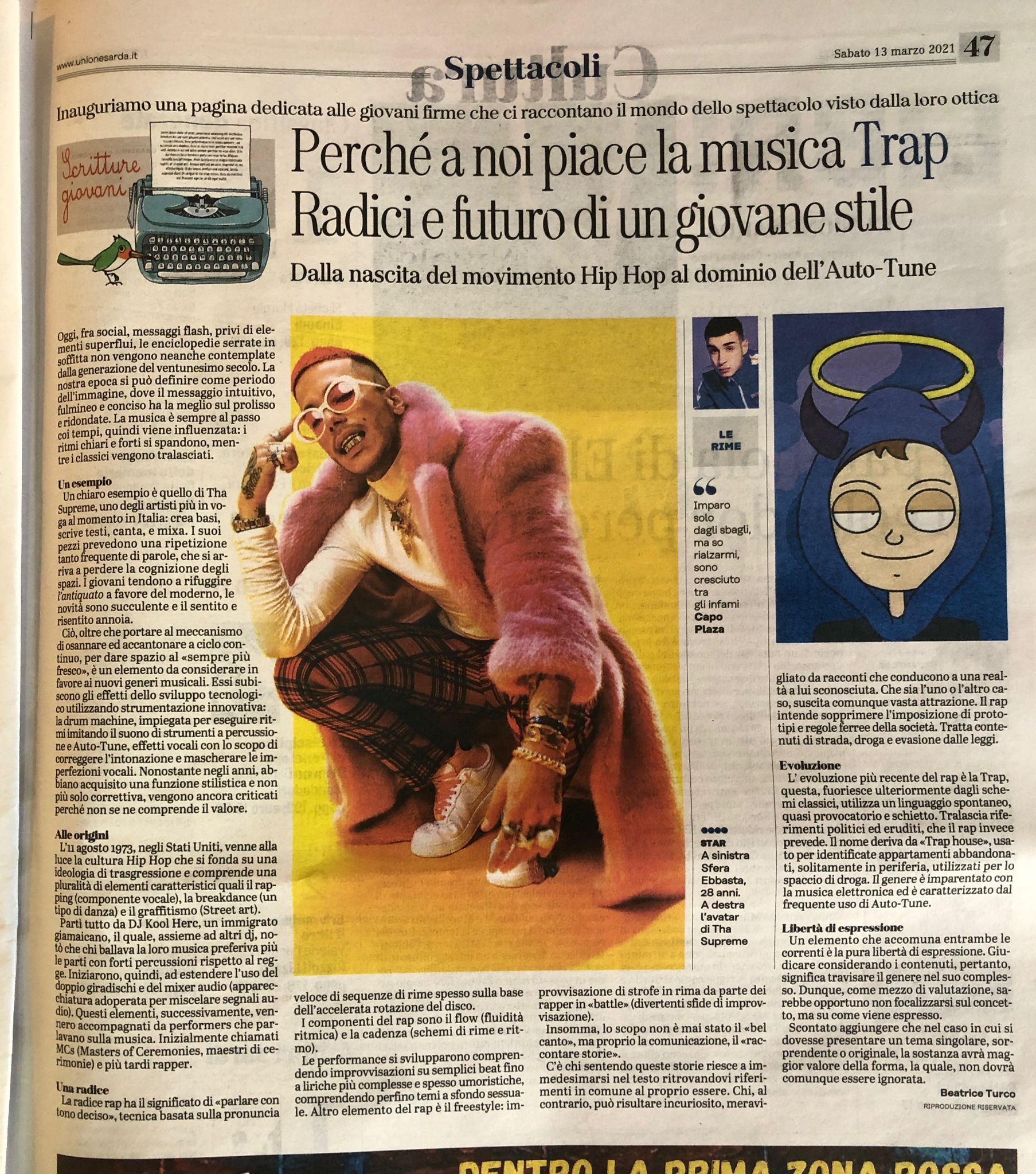 La testata giornalistica “L’Unione Sarda” apre “Una pagina dedicata alle giovani firme che ci raccontano il mondo dello spettacolo visto dalla loro ottica”. Un articolo della diciassettenne Beatrice Turco.